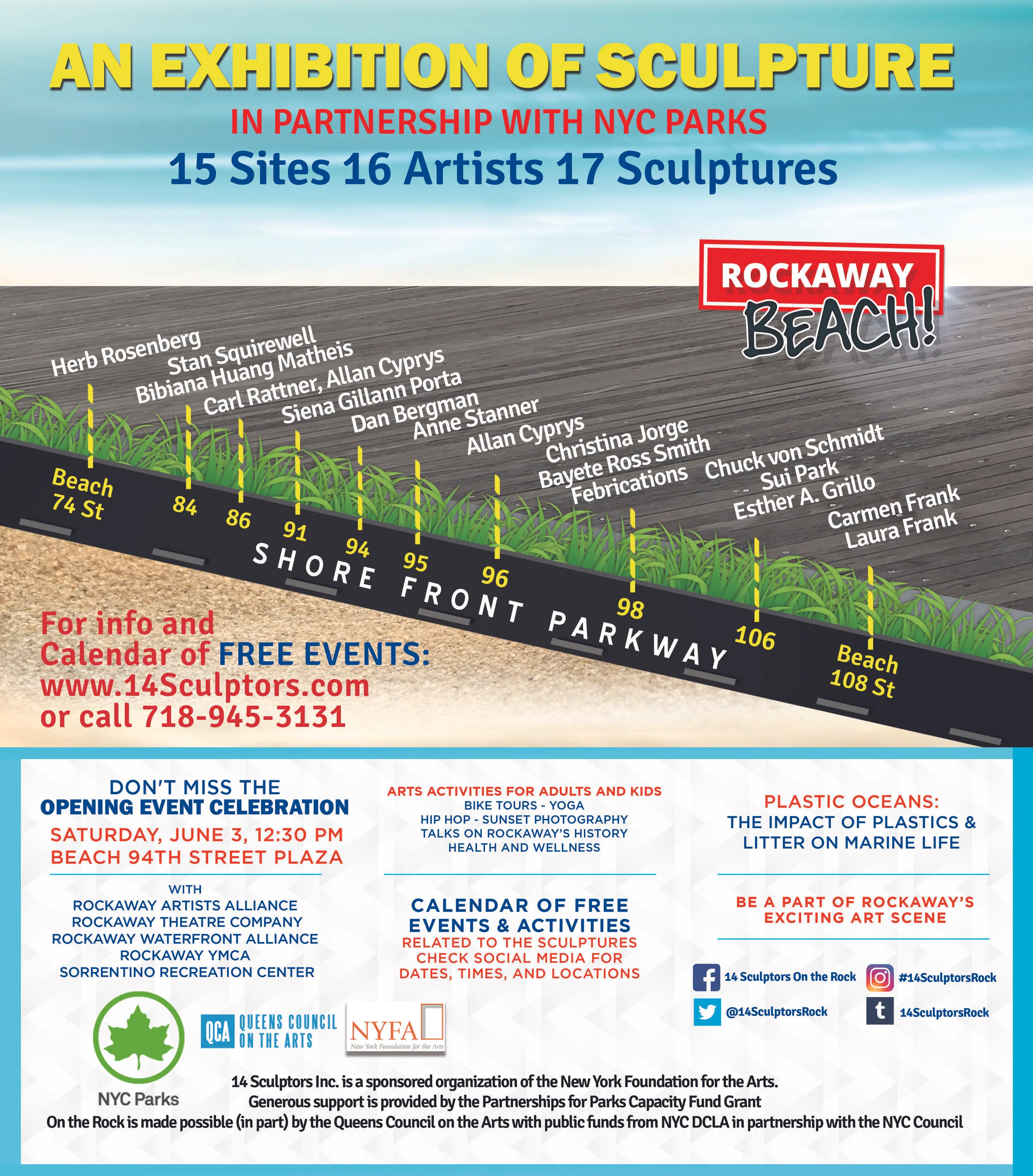 14 Sculptors Inc. On the Rock 2017: An Exhibition of Sculpture Saturday, June 3, 2017 12:03 PM 5:00 PM 12:03 17:00 Shore Front Parkway @ Beach 95 Queens, NY United States (map) Google Calendar ICS NY1 News Video:http://www.ny1.com/nyc/queens/news/2017/05/10/boardwalk-art-sends-a-message-in-the-rockaways.html
